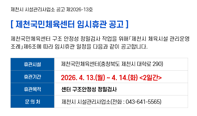 임시휴관 안내 작성일 2026-03-13 10:33 첨부자료 - 20260313103305_○ 제천국민체육센터 임시휴관 안내.hwpx 파일 다운로드 - 20260313103305_제천국민체육센터 임시휴관 공고.hwp 파일 다운로드 목록